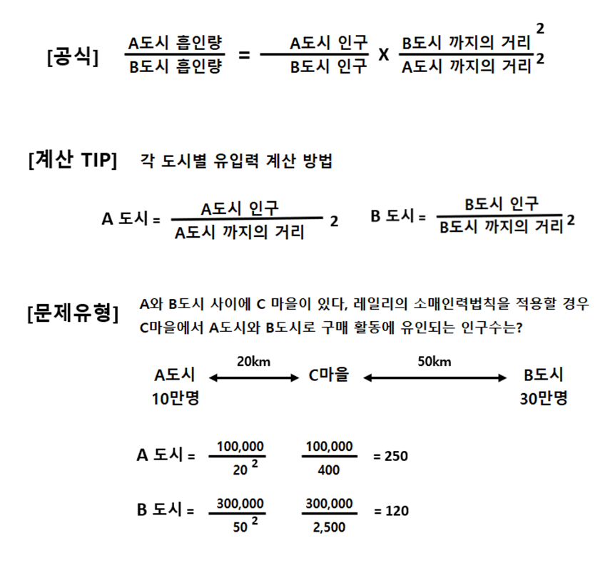 → 즉, 구매확률은 상업지 매장면적에 비례, 상업지 도달거리 제곱에 반비례